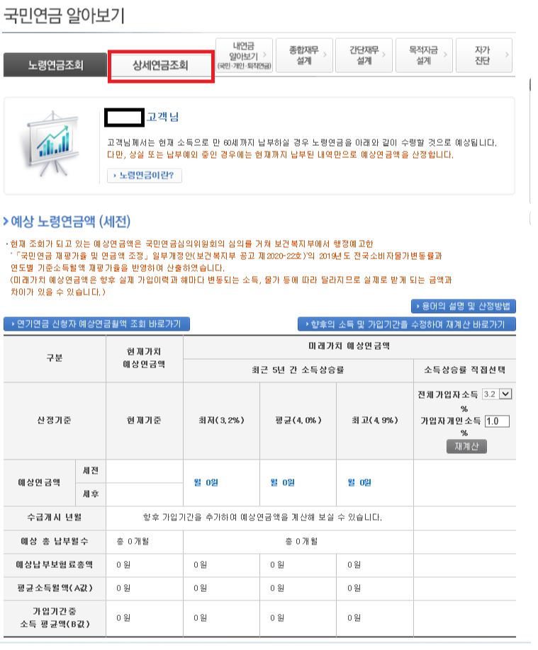 4.다음은 부양가족연금, 추가 크레딧, 지급희망연령 등의 상세 조건을 기입하여 정확한 예상연금액을 확인하는 상세연금조회입니다😀